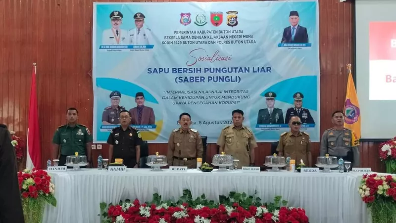 ULASSULTRA.COM-Pungutuan liar harus diberantas. Olehnya itu, Pemerintah Kabupaten Buton Utara menyelenggarakan Sosialisasi Saber Pungli diselanggarakanbekerjasama dengan Kejaksaan Negeri Muna, Polres Butur dan Kodim 1429, dengan tema “Internalisasi Nilai-nilai Integritas Dalam Kehidupan Untuk Mendukung Upaya Pencegahan Korupsi”. Seremonial dibuka langsung Bupati Buton Utara (Butur) Dr. H. Muhammad Ridwan Zakariah, M.Si., membuka dengan resmi Sosialisasi Sapu Bersih Pungutan Liar (Saber Pungli), di aula Bappeda Butur. Senin, 5 Agustus 2024.